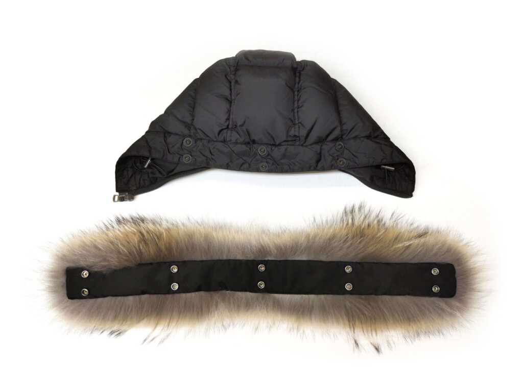金属製のスナップボタンで脱着可能になっており、ファーの裏面のボタンには、本体側のボタンと互換性のあるパーツを使用しております。ファー素材には厳選した北米産コヨーテを使用しております。