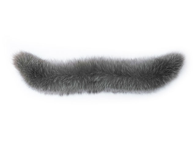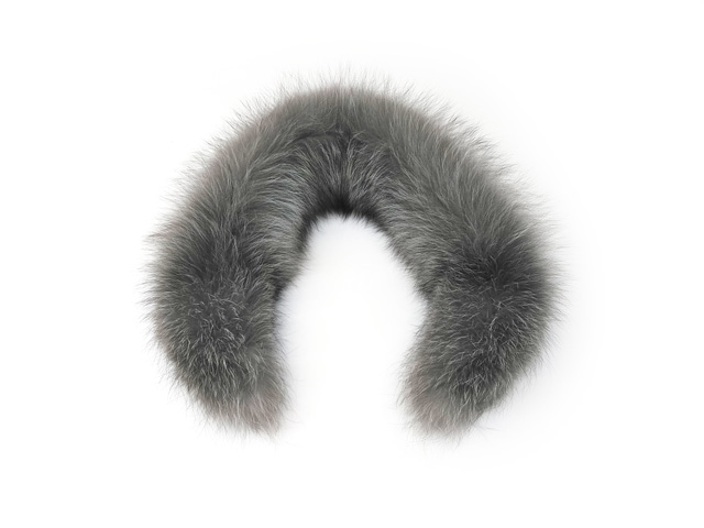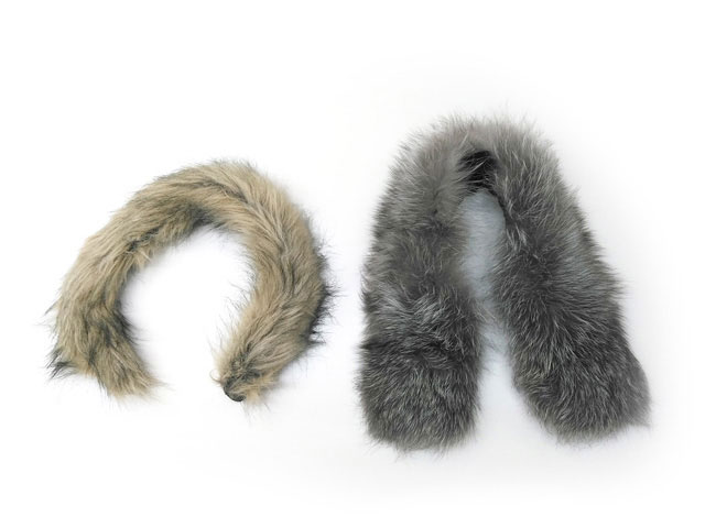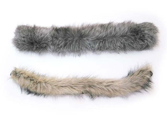 下の画像は加工前のフォックスと元のフェイクファーです。フード用の取り外しファーとして販売されていたもののようですが、長さは足りなかったので若干手直ししてお作りしております。