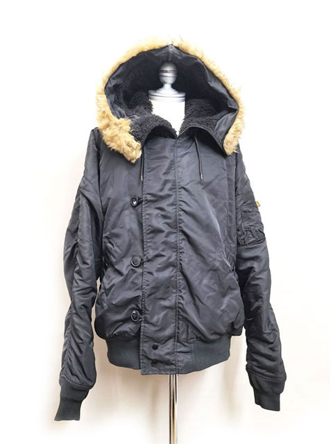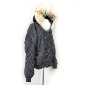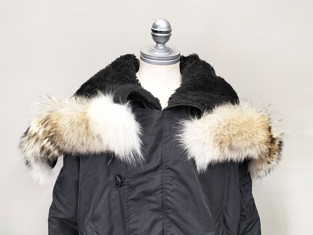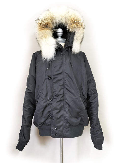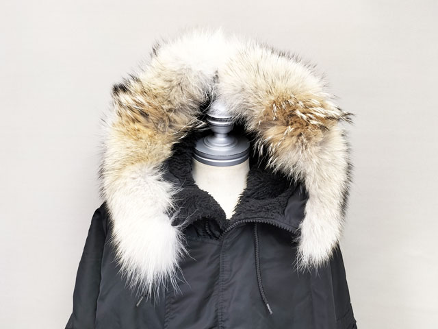 ALPHA アルファー社の 「N-2B」モデルのフライトジャケット。フードトリムのフェイクファーをコヨーテのリアルファーに交換しカスタマイズしました。ブラックの生地に映えるナチュラルカラーのコヨーテ。選び抜いた北米産コヨーテ原皮を使用しております。本体フードの形状に合わせて型紙を作り裁断縫製しております。
