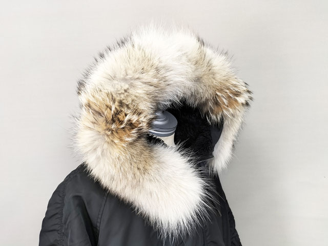中心からファスナーで左右に分かれるN-2Bならではの仕様で、右の方が構造上数センチ長くなっていますが、あくまでも中心から左右対称のルックスになるように慎重に原料を裁断をしています。コヨーテは背筋の黒く毛の長い部分が特徴的なので、これが左右の違う変なバランスの悪い位置に来るとカッコ悪いので気を付けているところです。