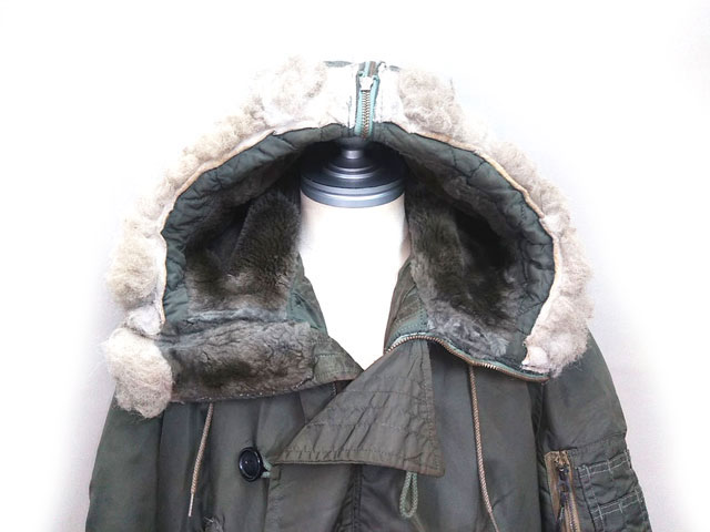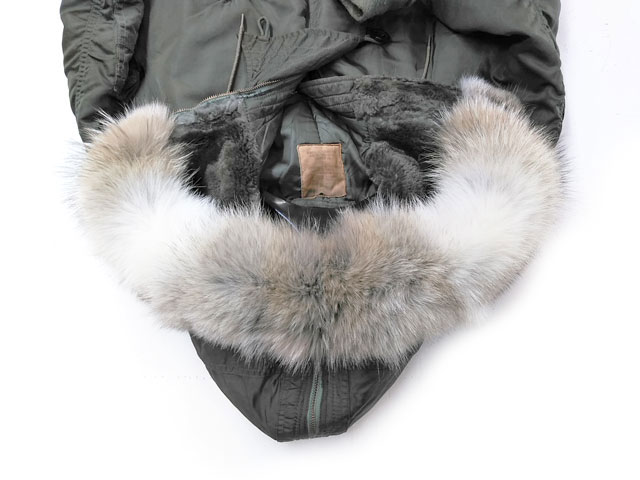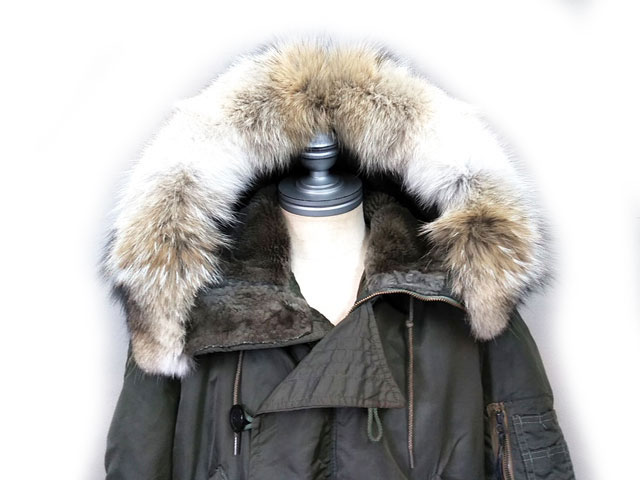 N-2B ミリタリーウェア とても古く、幾度も修理され、大事に着用されてきた事が分かるヴィンテージのN-2Bモデルでした。古いフェイクファーを外し、そこの部分にコヨーテファーを取り付けました。もっと古いタイプにはもともとコヨーテの毛皮が取り付けてある物もあります。
