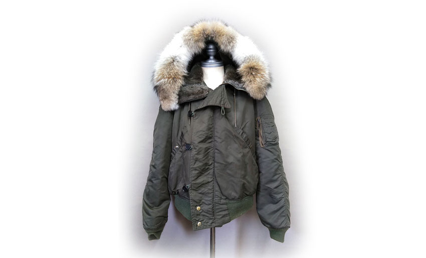 N-2B ミリタリーウェア とても古く、幾度も修理され、大事に着用されてきた事が分かるヴィンテージのN-2Bモデルでした。古いフェイクファーを外し、そこの部分にコヨーテファーを取り付けました。もっと古いタイプにはもともとコヨーテの毛皮が取り付けてある物もあります。